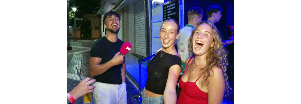 De trouwe PowNed-kijkers zullen hem gelijk herkennen. Dit multitalent is namelijk niet alleen dj, hij is ook één van de vaste PowNews-verslaggevers. Daarom gaat hij tussendoor ook op pad met de roze microfoon voor interviews met feestende jongeren in de Griekse badplaats.
