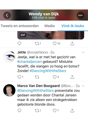 Via het account @Wendy_Ushi op Twitter zijn zaterdagavond haattweets over Chantal Janzen geliked. Er werden ‘vind-ik-leuks’ uitgedeeld aan een aantal snedige tweets over de ‘vreselijke presentatie’ van het televisieprogramma Dancing With the Stars. Wendy van Dijk kwam er vrij snel achter dat tot haar verbazing een derde persoon dit aan het doen was.