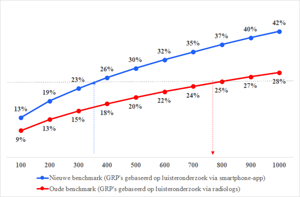 Een radiocampagne met een gemiddeld aantal GRP’s van 350 volgens het nieuwe benchmarkmodel, wordt aan het einde van de campagne naar verwachting door 24,7% van de consumenten herkend. In het oude benchmarkmodel zou exact dezelfde herkenningsscore zijn behaald met 771 GRP’s. Dat is dus een factor van 2,2.