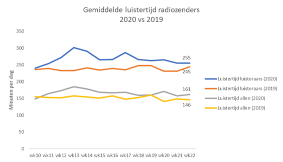 Hoewel er sprake is van een lichte daling na de sterk stijgende lijn aan het begin van de crisis, blijkt uit de analyse dat het niveau van de gemiddelde luistertijd hoger ligt dan voor de crisis en hoger dan een jaar geleden. Op totaalniveau wordt er in week 22 10% meer geluisterd naar radiozenders (week 22 2020: 161 minuten, week 22 2019: 146 minuten). Onder radioluisteraars is de gemiddelde luistertijd 4% hoger (255 minuten vs. 245 minuten).