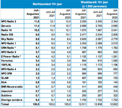 De luistercijfers van het Nationaal Luister Onderzoek over de periode juli-augustus 2021 zijn bekendgemaakt. NPO Radio 2 is nog steeds de marktleider met een aandeel van 11,8 procent. Dat was in de vorige periode 12,1 procent.