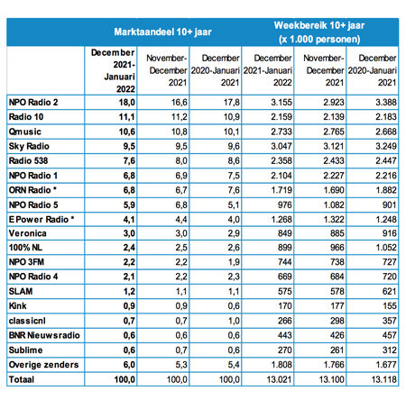 De luistercijfers van het Nationaal Luister Onderzoek over de periode december 2021-januari 2022 zijn bekendgemaakt. NPO Radio 2 is de marktleider met een aandeel van 18,0 procent, mede dankzij de uitzending van de Top 2000.