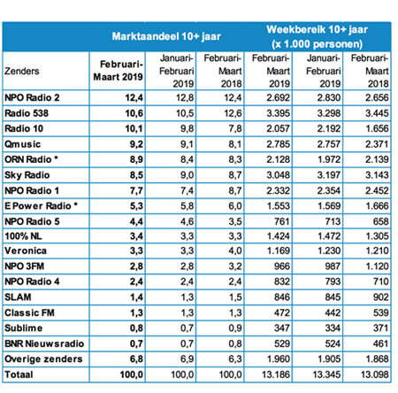 De luistercijfers van het Nationaal Luister Onderzoek over de periode februari-maart 2019 zijn bekendgemaakt. De rapportage is gebaseerd op een landelijk representatieve steekproef van 7.208 respondenten van 10 jaar en ouder.