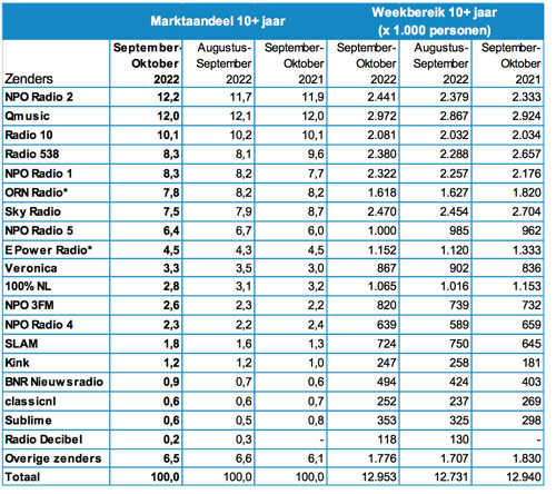 De luistercijfers van het Nationaal Luister Onderzoek over de periode september-oktober 2022 zijn bekendgemaakt. NPO Radio 2 is met een aandeel van 12,2 procent de marktleider en heeft daarmee Qmusic ingehaald.