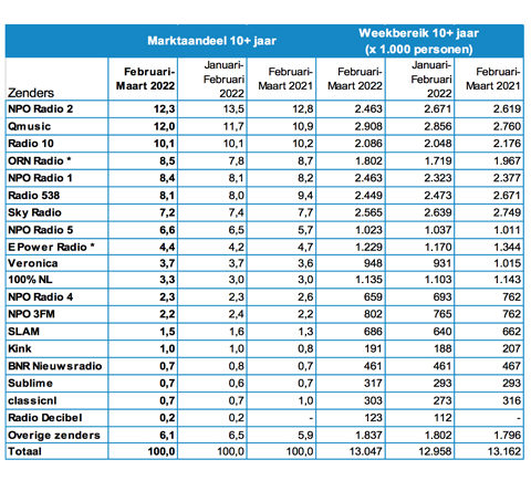 De luistercijfers van het Nationaal Luister Onderzoek over de periode februari-maart 2022 zijn bekendgemaakt. NPO Radio 2 is marktleider met een aandeel van 12,3 procent. In de vorige periode was dat nog 13,5 procent.