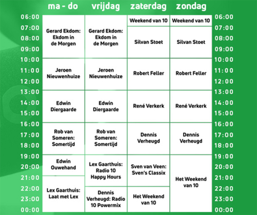 Na de eerder aangekondigde wijzigingen is de nieuwe programmering van Radio 10 nu volledig rond. Robert Feller verhuist naar het weekend en presenteert iedere zaterdag en zondag een programma tussen 10.00 en 13.00 uur. Het programma Laat met Lex is van maandag tot en met donderdag tussen 21.00 en 00.00 uur te horen. Op vrijdagavond luidt Lex Gaarthuis tussen 19.00 en 22.00 uur het weekend in met het programma Radio 10 Happy Hours. Evenals in Laat met Lex staat ook in dit programma de luisteraar centraal. Zij bepalen welke nummers er gedraaid worden.