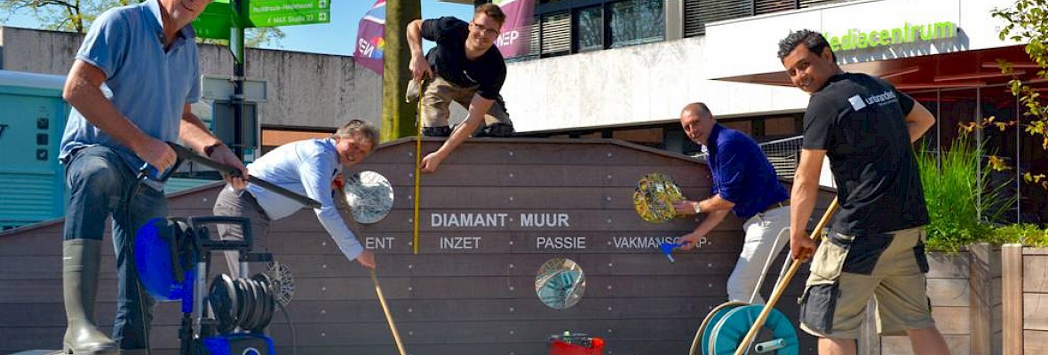 Met de Media Diamant wordt erkenning gegeven aan bijzondere medewerkers áchter de schermen van radio, televisie en internet. In 2015 werd de eerste Media Diamant toegekend aan regieassistente Ilse Pollen. Later in het jaar viel de eer te beurt aan hoofd geluidstechnicus Theo Rutten. In 2016 kregen senior geluidstechnicus Paul Raaijman, projectbegeleider Juliet Wagenaar en senior cameraman Peter Bakker de erkenning. De prijs bestaat uit een plaquette, ontworpen door Anneke Schat, die vanmiddag dus officieel wordt onthuld op de Diamantmuur op het Joop van den Ende plein op het Media Park. Die is voor de gelegenheid natuurlijk even opgepoetst door mede-initiatiefnemer Jos Budie (links) en de zijnen.
