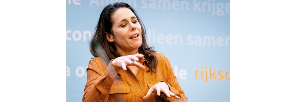 Gebarentolk Sluis werd in de afgelopen anderhalf jaar heel populair door haar rol bij de coronapersconferenties van het inmiddels demissionaire kabinet. Vooral haar vertolking van het woord ‘hamsteren’ viel op. Door de populariteit van Sluis is het animo voor de opleiding Tolk NGT van de Hogeschool Utrecht toegenomen.
